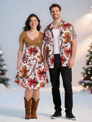 Matching Outfits > Christmas Gingerbread Candy Holly Fruit Bowknot Snowflake Print Plus Size Matching Outfit For Couples
