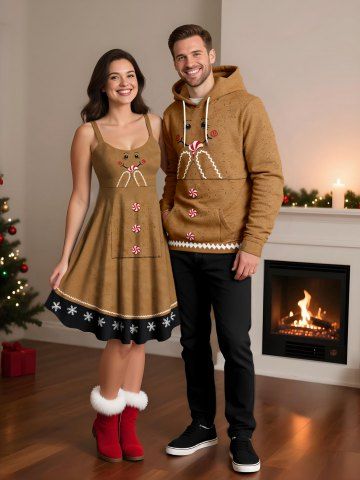 Matching Outfits > Christmas Gingerbread Smile Face Candy Print Plus Size Matching Outfit For Couples