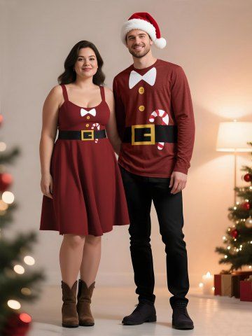 Matching Outfits > Christmas Santa Claus Candy Bowknot Belt Print Plus Size Matching Outfit For Couples