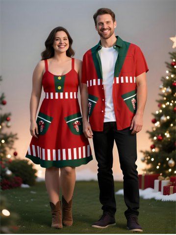 Matching Outfits > Christmas Santa Claus Costume Candy Print Plus Size Matching Outfit For Couples