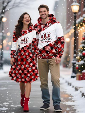 Matching Outfits > Christmas Santa Claus Snowflake Plaid Print Plus Size Matching Outfit For Couples