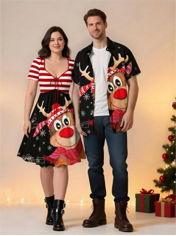 Matching Outfits > Christmas Snowflake Elk Gift Striped Print Plus Size Matching Outfit For Couples