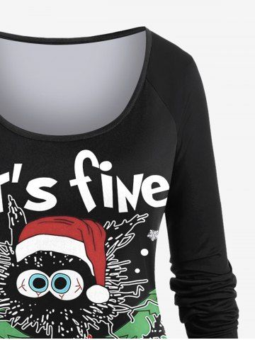 Christmas Tree Hat Cat Letters Print Long Sleeves T-shirt and Leggings Plus Size Matching Set - Black