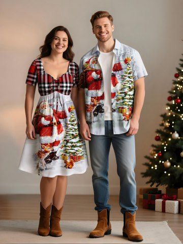 Matching Outfits > Christmas Tree Santa Claus Elk Squirrel Plaid Print Plus Size Matching Outfit For Couples