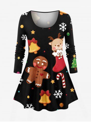Christmas Tree Snowflake Gingerbread Bell Stocking Candy Print Women T-shirt and Flare Pants Plus Size Matching Set - Black