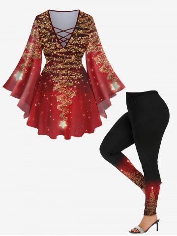 Christmas Tree Star Glitter Sparkling Sequin 3D Print Plus Size Matching Set - Deep Red