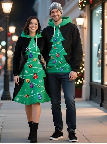 Cosplay Christmas Tree Ball Snowflake Print Plus Size Matching Outfit For Couples - Green