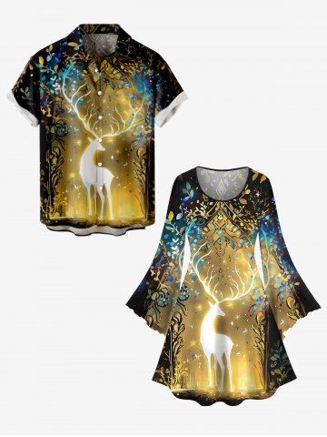 Matching Outfits > Glitter Christmas Elk Branch Leaf Print Plus Size Matching Outfit For Couples