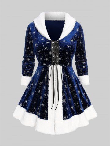 k*****95Christmas Plus Size Lace Up Silver Stamping Fur Trim Velvet CoatColor: BLUE Size: 3X | US 22-24I love rosegal i always get the 3x and it fits perfect ! nIm short and chubby and the cut is very flattering .