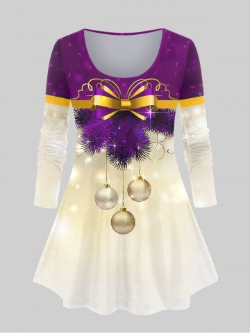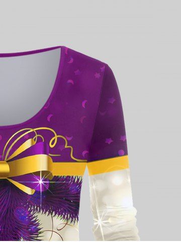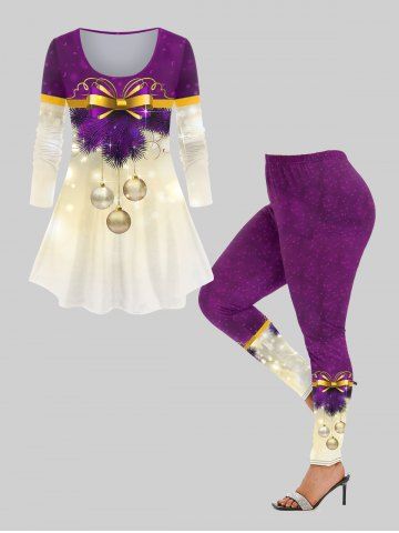 Plus Size Christmas Tree Bowknot Ball Print T-shirt and Leggings Outfits - Purple