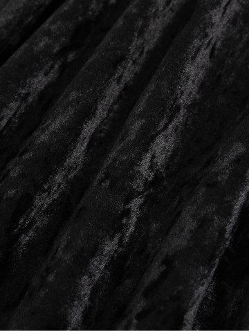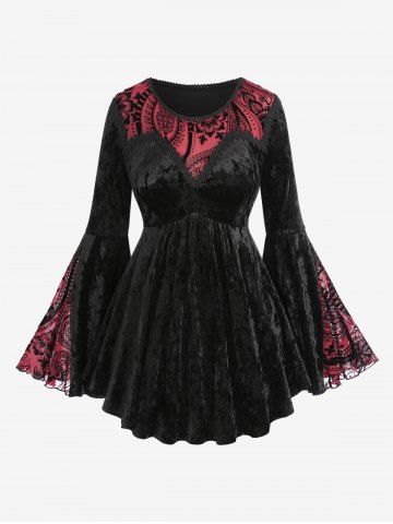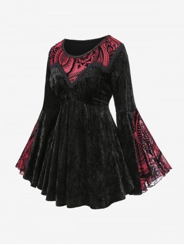 K*****n5Gothic Plus Size Appliques Lace Trim Flocked Flower Flare Sleeves Velvet T-shirtColor: BLACK Size: 1X | US 14-16very cute love fabric sold out fast. I am glad i bought it when I did, and it came fast.