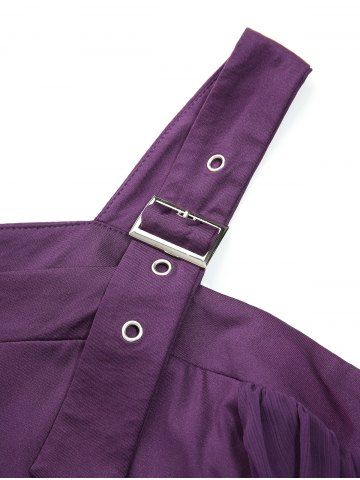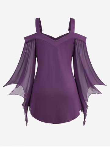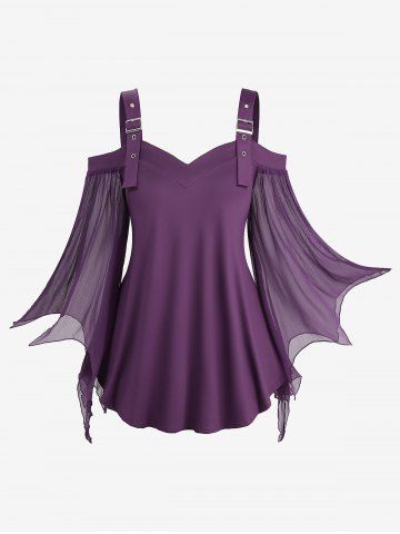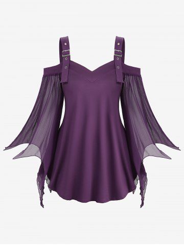 Plus Size Cold Shoulder Buckle Straps Mesh Bell Sleeve Top
