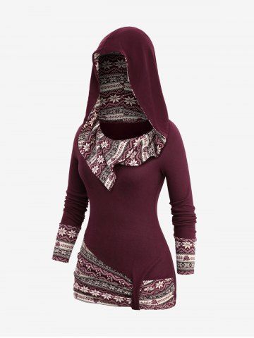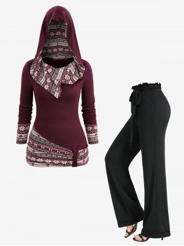 Ethnic Floral Print Asymmetrical Hooded Top and Solid Color Ruffles Waist Pants Plus Size Outfit - Deep Red