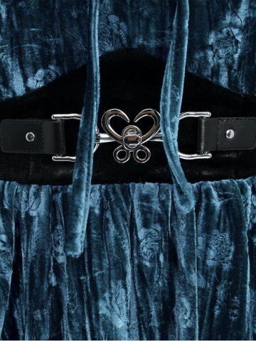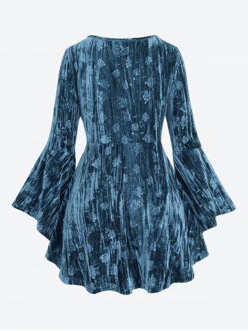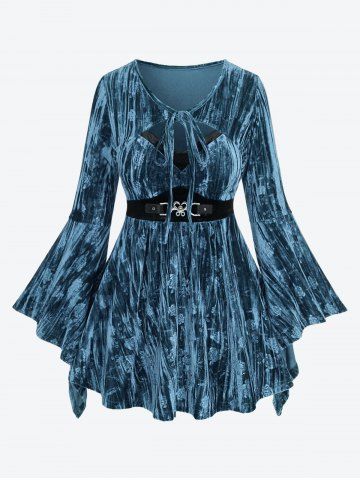 Frilled Embossed Flare Sleeves Cut Out Panel Tied Belted Velvet T-shirt and Ribbed Solid Stirrup Leggings Plus Size Outfit - Deep Blue