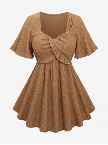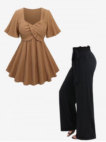 Hollow Out Ruffles Embroidery Rhombus Surplice Top and Solid Color Wide Leg Pants Plus Size Outfit - Coffee