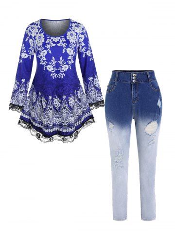 H*****r5Plus Size Plaid Ombre Color T-shirt and Dip Dye Ripped Jeans OutfitColor: LIGHT BLUESo comfortable! Amazing fit just right. Absolutely in love with this set.