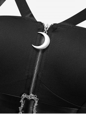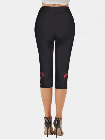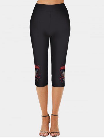 Moon Zipper Buckle Waist Ruffles Asymmetrical Tank Top and Mushroom Printed Elastic Capri Leggings Plus Size Outfit - Black