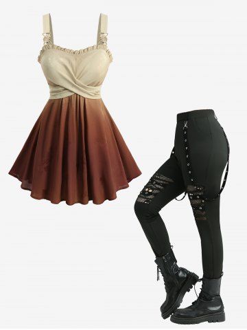 Outfit Bundles > Ombre Flowers Jacquard Tank Top and Skull Hollow Out Fish Net Patchwork Leggings Plus Size Outfit