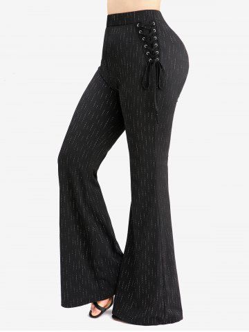 a*****y5Plus Size Glitter Line Insert Lace Up Ribbed Pull On Flare PantsColor: BLACK Size: 4X | US 26-28I love these pants. The stripes have a sparkle to them and they are super comfortable. Paired it with a chunky heel and nice top. Worked perfectly.