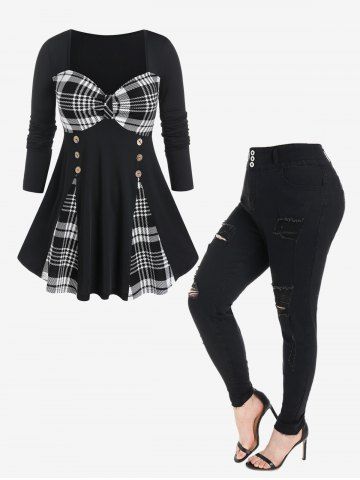 c*****l5Plus Size Plaid Grommets 2 in 1 Tee and High Rise Ripped Jeans OutfitColor: BLACKDoesn’t quite look like the picture- but I love it MORE in person!