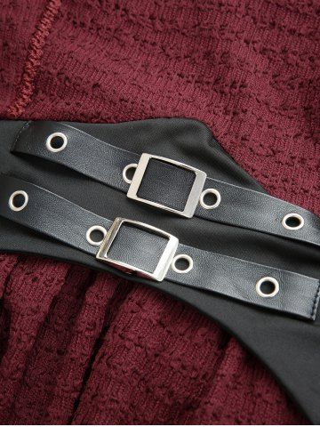 Rose Flower Lace Knotted Chiffon Top and Textured Crinkle PU Strap Belted Dress Plus Size Outfit - Black