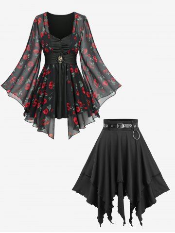 Rose Flower Print Ruched Belted 2 in 1 Top and Solid Layered Handkerchief A Line Skirt Outfit - Black