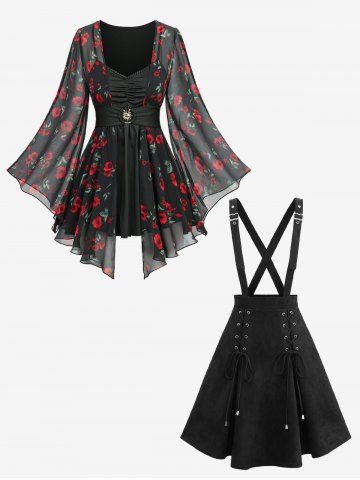 Rose Flower Printed Ruched Belted 2 in 1 Top and Lace Up Crisscross Strappy A Line Skirt Outfit - Black