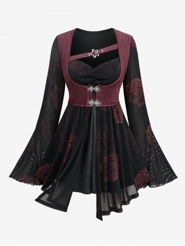R*****y5Gothic Plus Size Rose Flower Print Mesh Ruched Lace Trim Star Buckle Grommets Flare Sleeves 2 In 1 TopColor: BLACK Size: 1X | US 14-16It was for a friend, and I accidentally got the wrong size. Didn't hassle with returning, but altered it to fit her as is. Looks amazing!