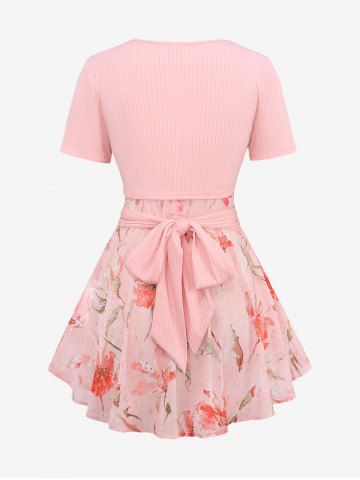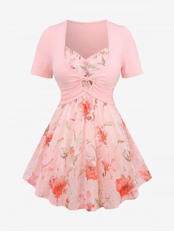 Plus Size Ruched Pearl Buckle Ruffles Hot Stamping Flower Print Chiffon Cami Top and Heart Ring Ribbed Textured Crop Top