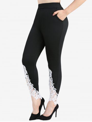 Plus Size Leaf Flowers Appliques Lace Pockets Leggings