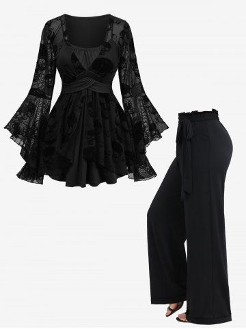Outfit Bundles > Skulls Flocking Lace Trim Flare Sleeve Top and Wide Leg Pants Plus Size Outfit