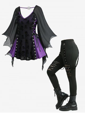 Skulls Flocking Lace Up Flare Sleeves Top and Skull Hollow Out Fishnet Leggings Plus Size Outfit - Black