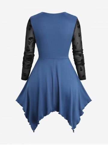 Skulls Flocking Twist Panel 2 In 1 Top and Hollow Out Fishnet Leggings Plus Size Outfit - Deep Blue