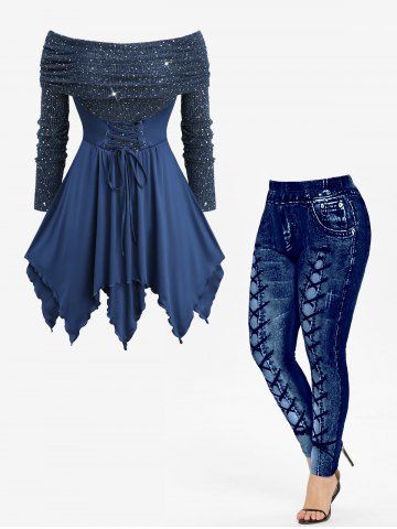 Sparkling Sequins Lace Up Asymmetrical Off The Shoulder Top and High Waisted 3D Print Leggings Plus Size Outfit - Deep Blue