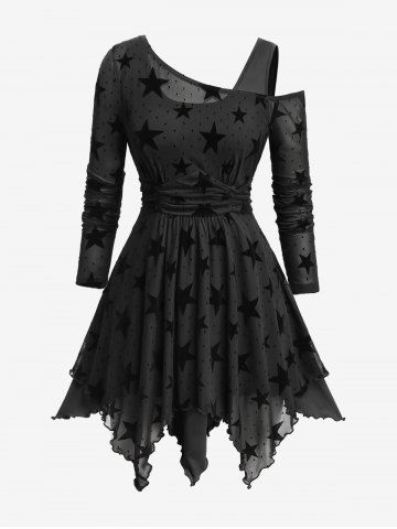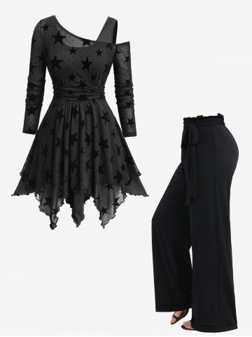 Stars Flocking Mesh Asymmetrical Neck Long Sleeve Top and Wide Leg Pants Plus Size Outfit - Black