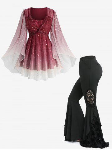 Outfit Bundles > Stars Silver Stamping Ombre Print Mesh Twist Flare Sleeves Top and Skull Flocking Applique Flare Pants Plus Size Outfit