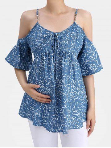 Plus Size Paint Splatter Print Lace Up Grommets Chains Cold Shoulder Maternity Blouse - Blue - S | Us 8
