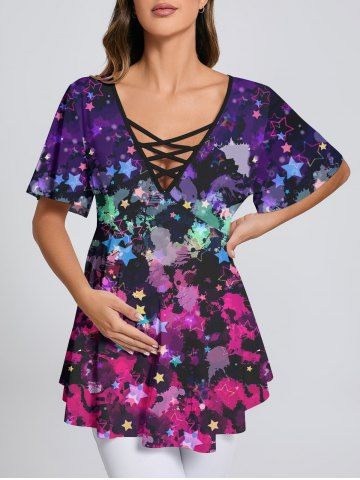 Plus Size Paint Splatter Star Print Crisscross Lattice Flare Sleeve Maternity T-shirt - Multi-a - 4x
