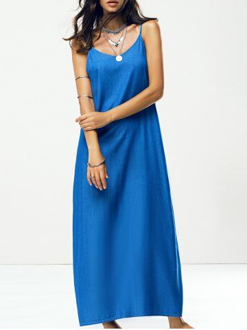 Spaghetti Strap Solid Color Backless Maxi Dress - Denim Blue - S