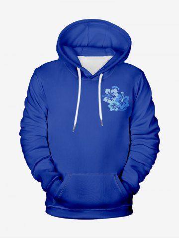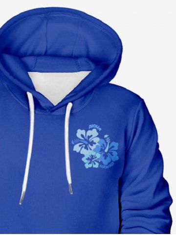 Plus Size Tropical Hibiscus Flowers Print Pocket Drawstring Hawaii Hoodie For Men - Blue - 3xl