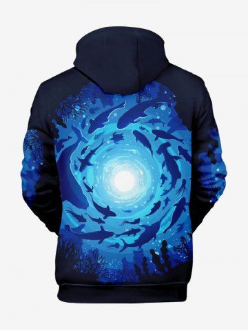Plus Size Underwater World Dolphin Print Pocket Drawstring Hawaii Hoodie For Men - Deep Blue - 6xl