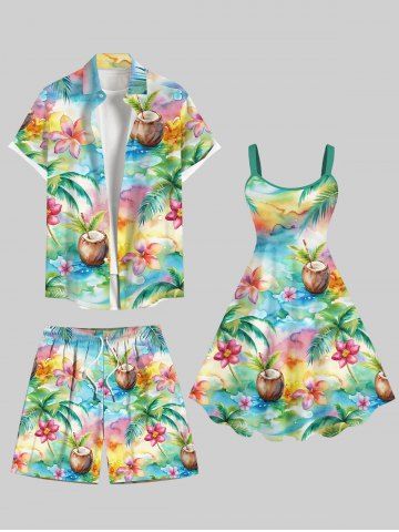 Shorts > Plus Size Coconut Tree Flower Ombre Watercolor Print Hawaii Drawstring Pocket Beach Shorts For Men