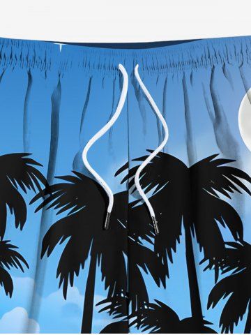 Plus Size Coconut Tree Moon Ombre Sky Print Hawaii Drawstring Beach Shorts For Men - Blue - L