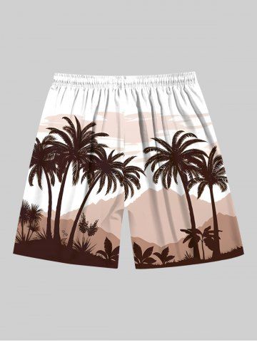Plus Size Coconut Tree Mountain Print Hawaii Drawstring Beach Shorts For Men - Coffee - L