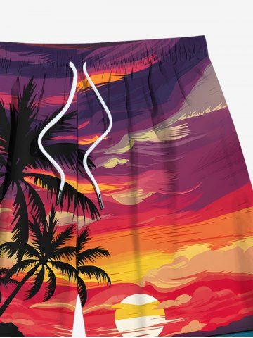 Plus Size Coconut Tree Ombre Dusk Sunset Sea Print Hawaii Drawstring Beach Shorts For Men - Red - 7xl