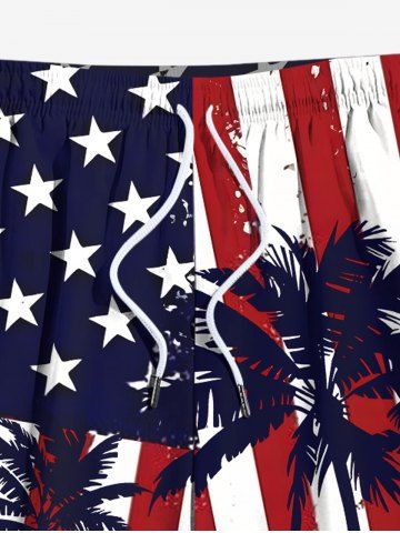 Plus Size Coconut Tree Patriotic American Flag Print Hawaii Drawstring Pocket Beach Shorts For Men - Red - 3xl
