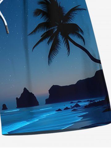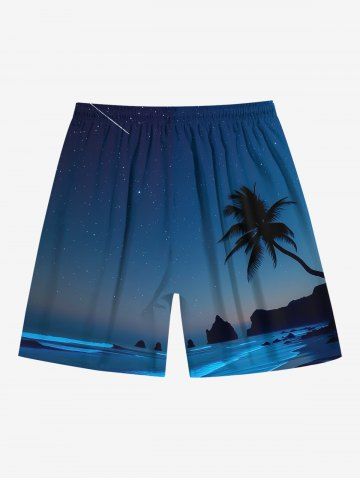 Plus Size Coconut Tree Sea Meteor Ombre Galaxy Print Hawaii Drawstring Beach Shorts For Men - Deep Blue - L