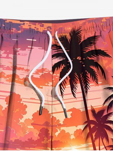 Plus Size Coconut Tree Sea Ombre Sky Dusk Print Hawaii Drawstring Beach Shorts For Men - Red - L
