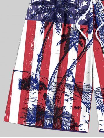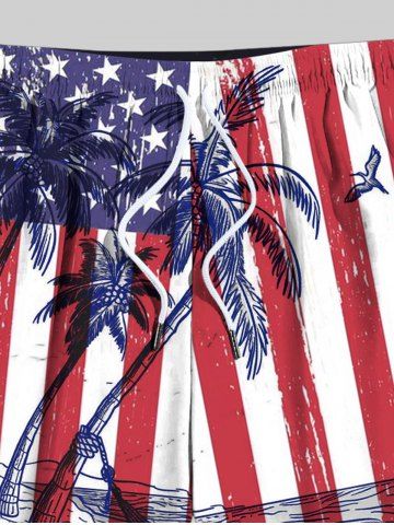 Plus Size Coconut Tree Sea Patriotic American Flag Print Hawaii Drawstring Beach Shorts For Men - Red - 2xl