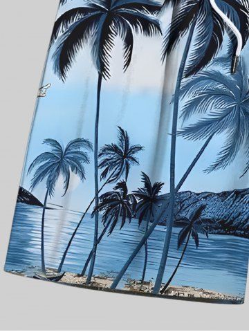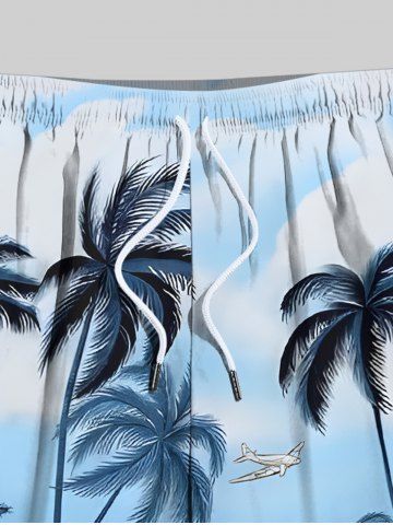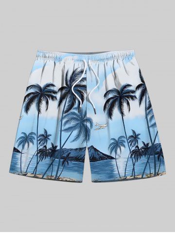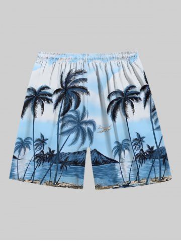 Plus Size Coconut Tree Sea Plane Print Hawaii Drawstring Beach Shorts For Men - Blue - 4xl